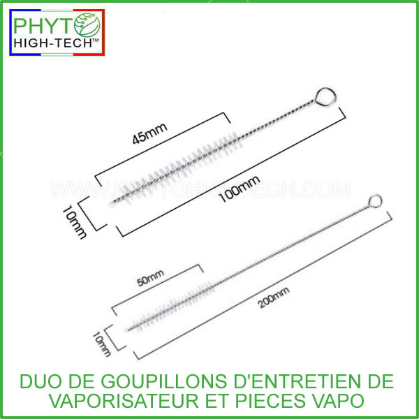 Ce set de deux goupillons est l'ensemble idéal d'outils pour le nettoyage des vaporisateurs et/ou de leurs accessoires notamment pour la qualité de fabrication et les matériaux utilisés dans la production de ces brosses nettoyantes qui vont être des accessoires durables et véritablement utiles dans le temps. Chacun des goupillons est doté d'une tige en acier inoxydable et d'un ensemble de fils nettoyants en nylon de grande qualité, le tout conçu à la base pour pouvoir être employé et utilisé en milieu stérilisé. Les matériaux de fabrication sont neutres empêchant toute migration ou réactions chimiques lors des opérations de nettoyage du vaporisateur ou de ses accessoires. Avec des longueurs respectives de 10cm et de 20cm et un radius d'action avec une envergure de 15mm ces goupillons répondront présents pour le nettoyage de tout type d'accessoire.